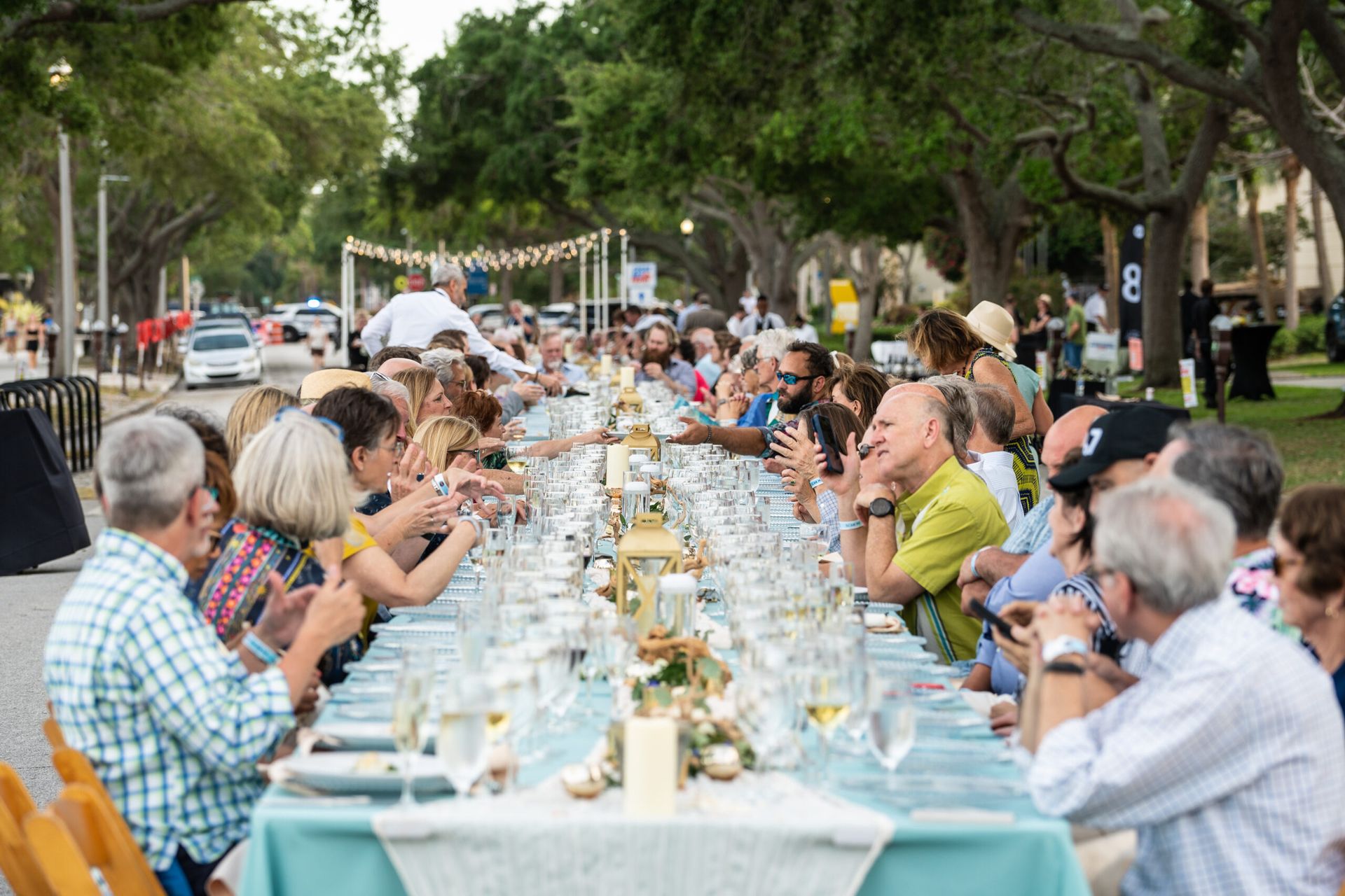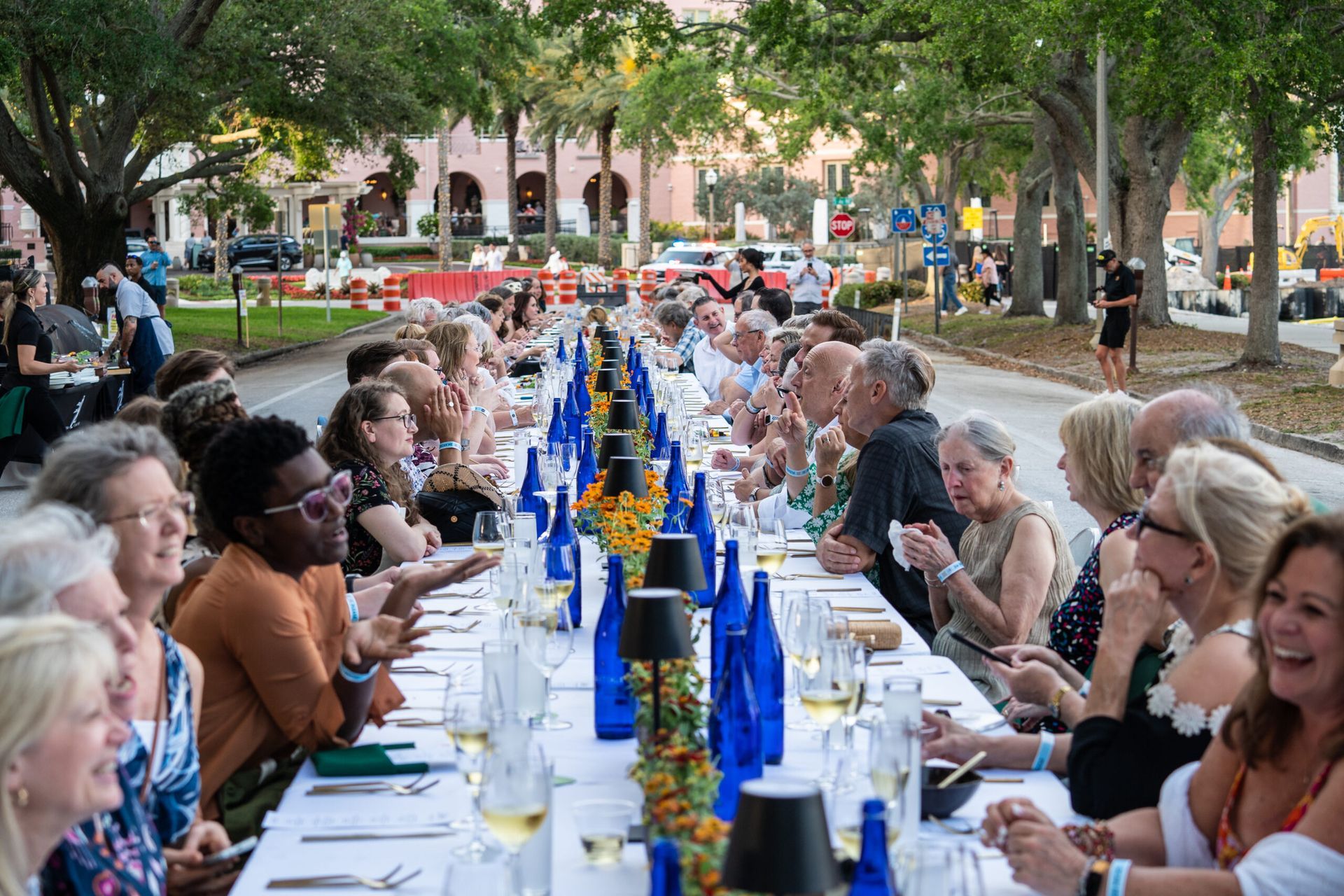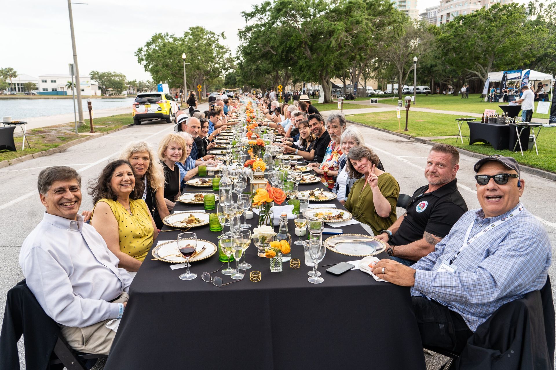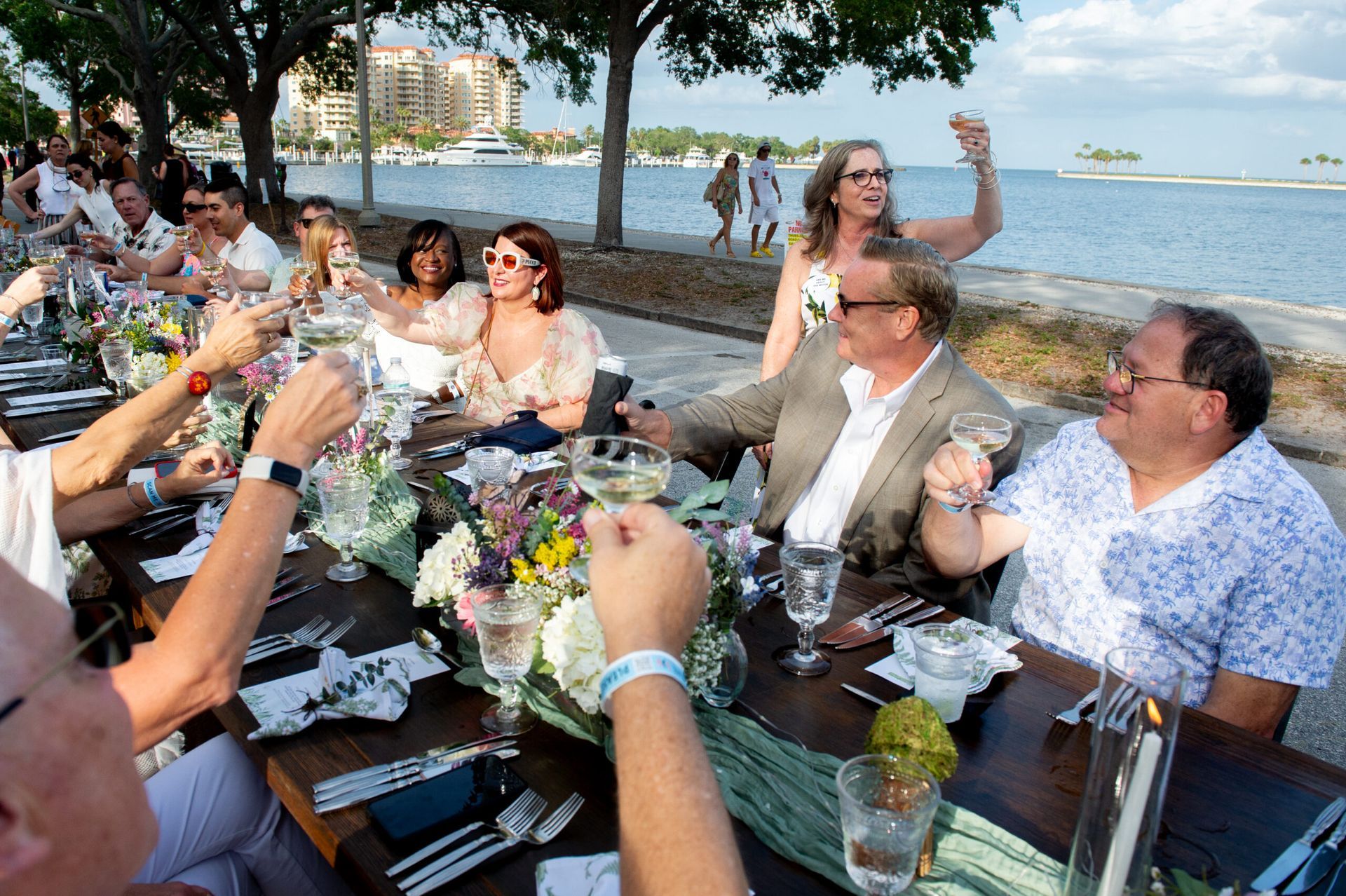- Features beautifully set tables stretching for blocks with waterfront views